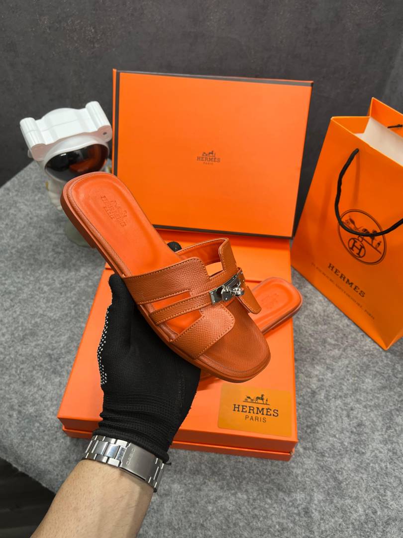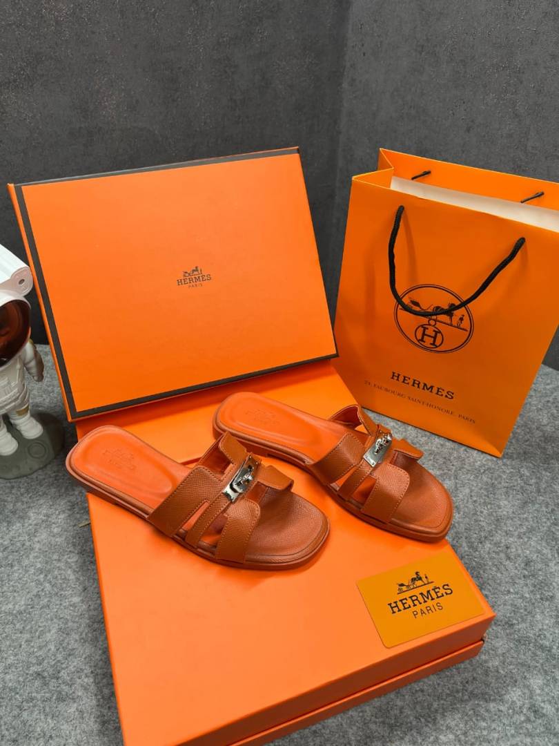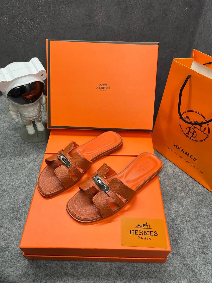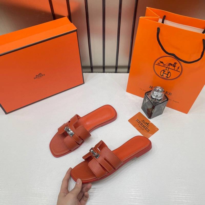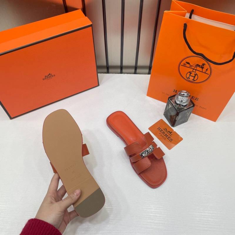 • Hermes Paris Oran Flats For Her With OG Box & Carry Bag H38-41 Orange Slide